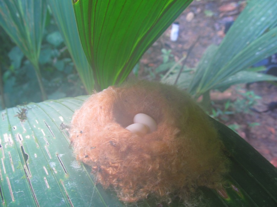 Notice how perfect the nest is, despite it being made by a very small hummingbird out of plant material and spiderweb, in the midst of seasonal rains.