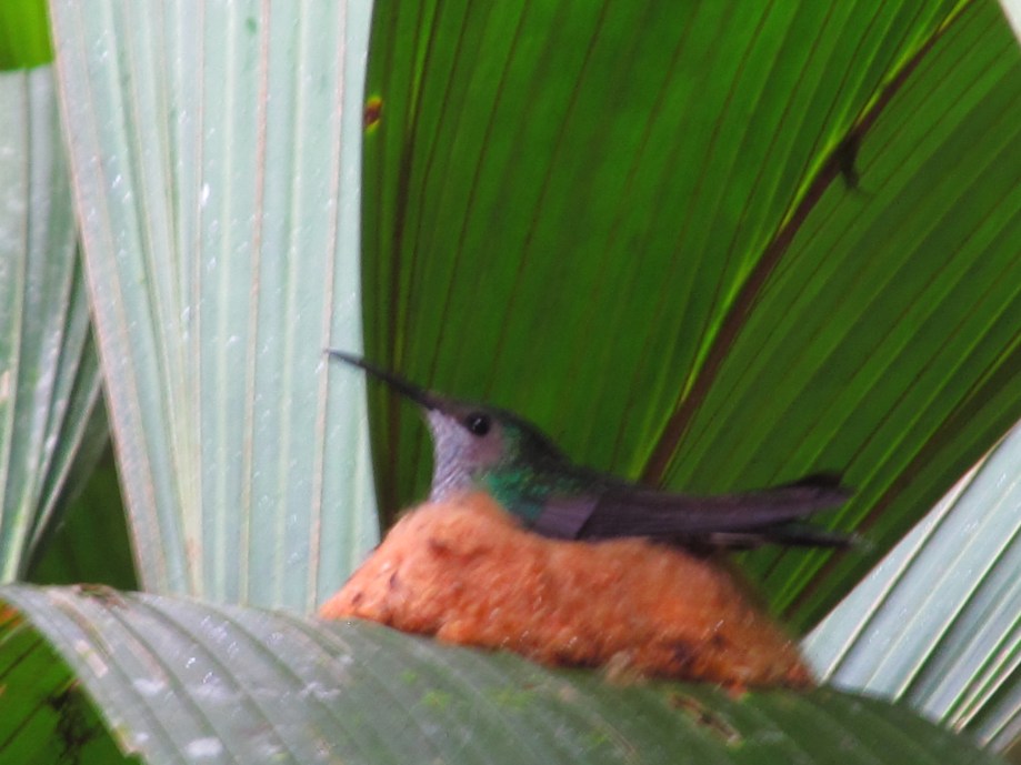 The female White-Necked Jacobin rests on her eggs before they’ve hatched.
