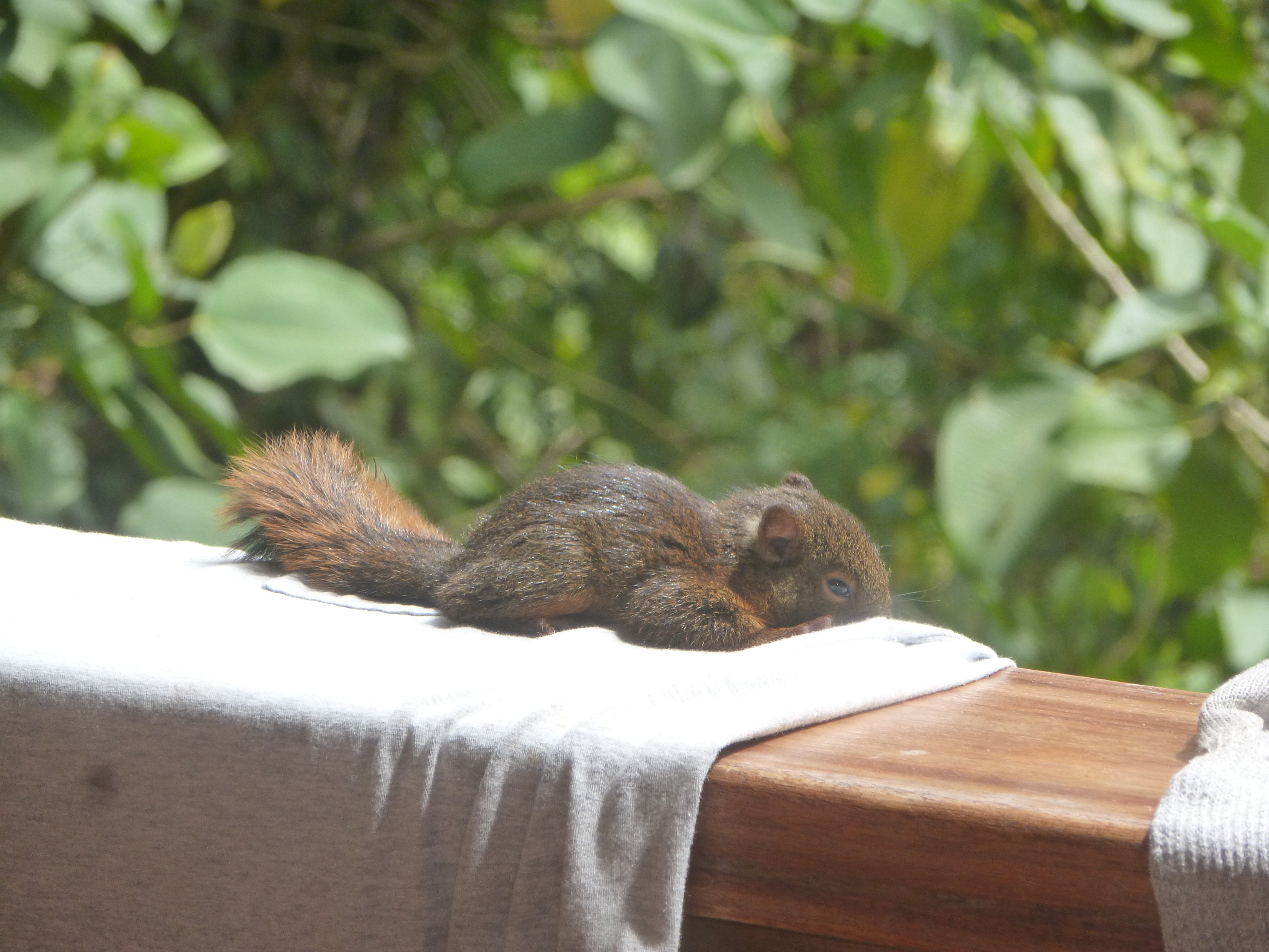 Although squirrels are a common site in the states, we had quite an uncommon experience with a red tailed squirrel here at the reserve. We came into the care of a young squirrel after it was abandoned by its mother during the installation of a fruit tree grove. For the next 3 weeks we acted as foster parents for this squirrel; weaning it off milk, introducing solid food and encouraging it to climb and forage.