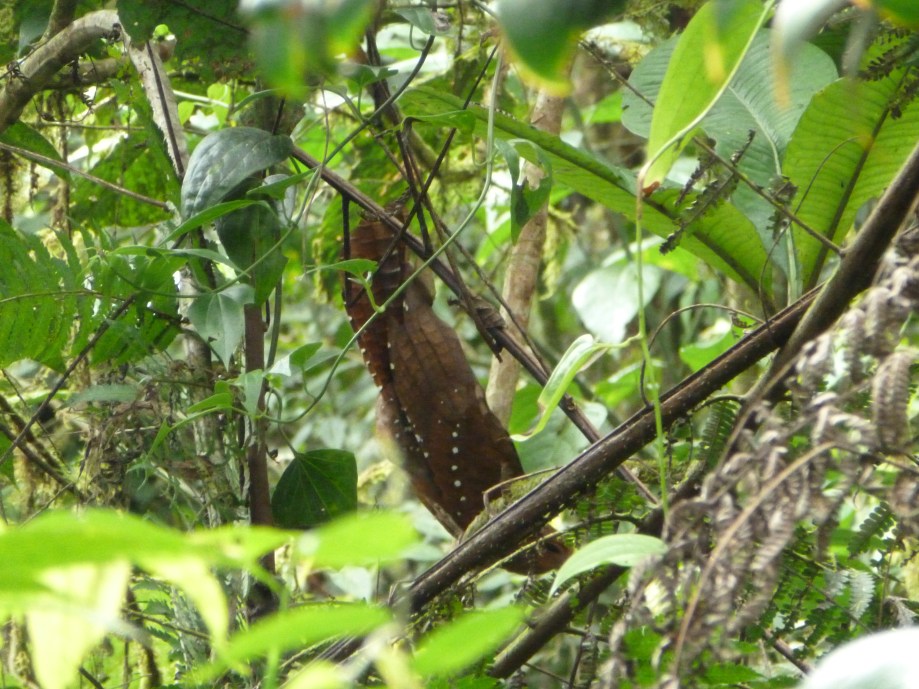 Oilbird hanging from branch (tail feathers up)