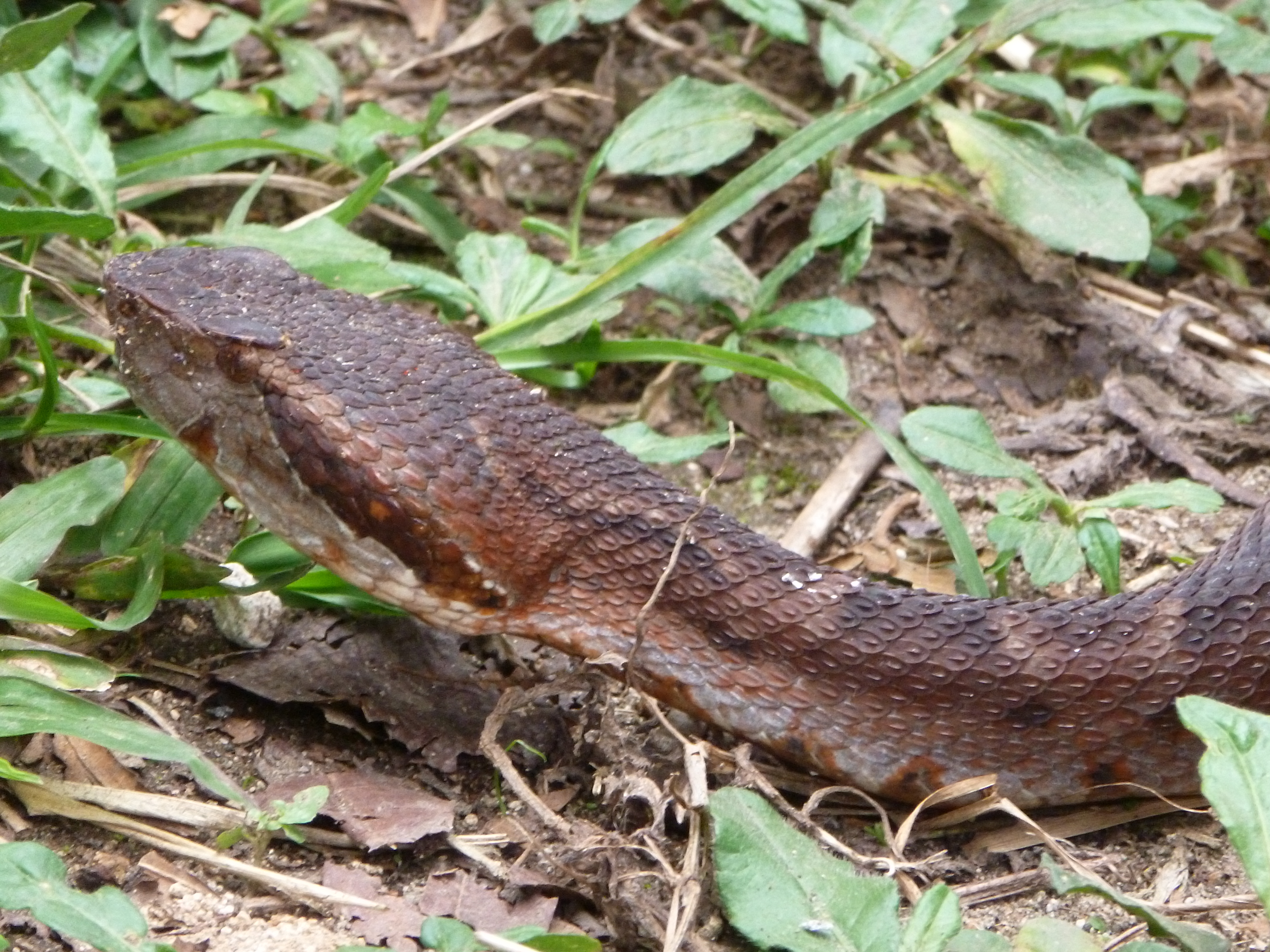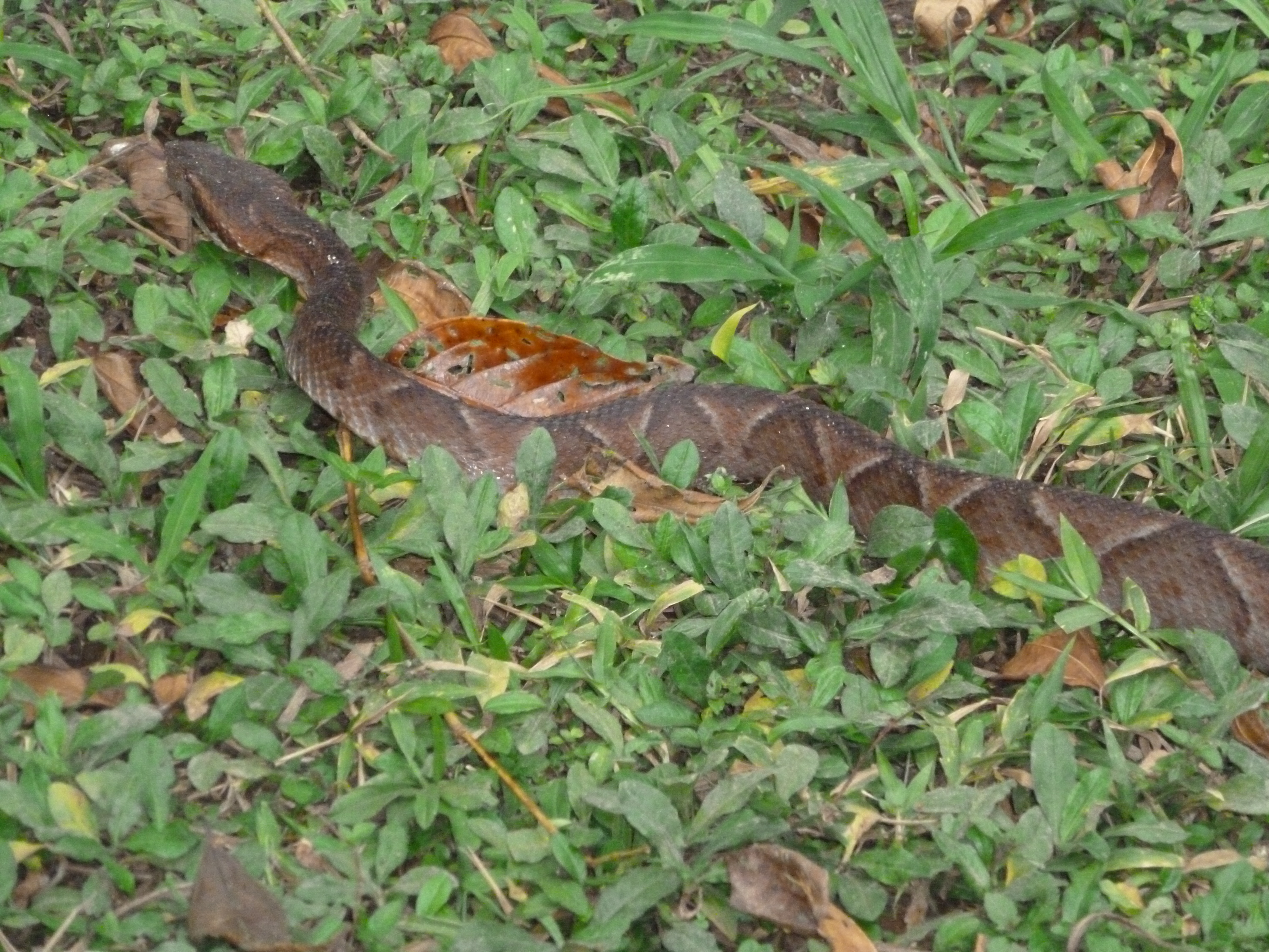 Well, we´ve saved the best for last.Our most jaw dropping (and heart-rate elevating) sighting has surely been the fer de lance. We´ve known that these highly venomous snakes inhabit this area, yet, though they are diurnal, they are rarely seen. We returned to the cabin one afternoon, after a day of erosion control at the Gallo de la Peña lek, to find this one coiled beside the front steps. We´ve seen several snakes over the months, but this fer de lance, at 1 meter long and thick in it´s midsection, was definitely the largest. As lethal as these snakes are, this one was content to rest in it´s coils while Amanda enthusiastically snapped photos and Shyama stood well back pondering his mortality. After an hour or so, we watched it make it´s was slowly off into the forest, and were able to appreciate it´s full size and beauty.