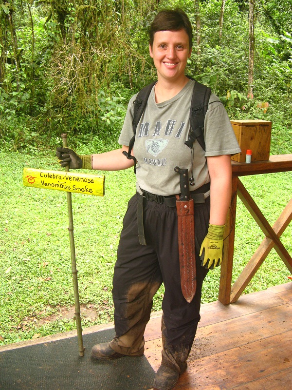 Steady rain means steady employment in trail maintainance. Standard gear for the job is boots, a pair of rain pants, and a machete to clear the downfall.