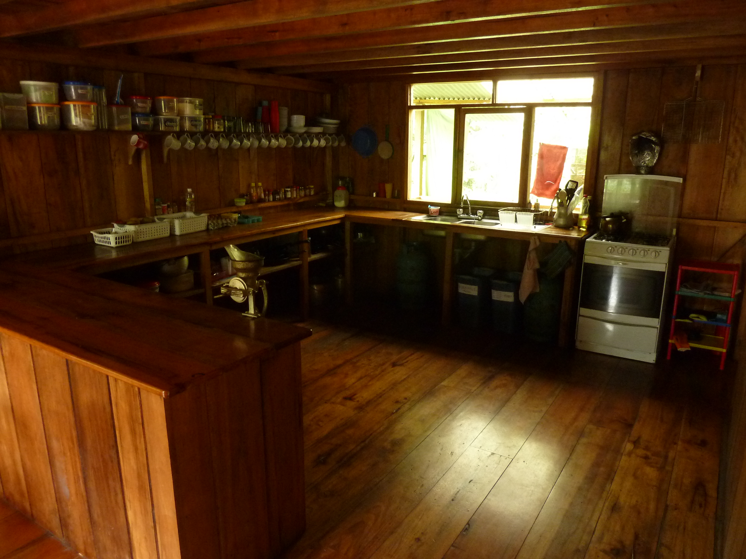 The bottom floor has the kitchen, dining area, living room, and full bath (yup, running water, flush toilet, hot shower – not too bad for the middle of nowhere!). The kitchen is enormous: