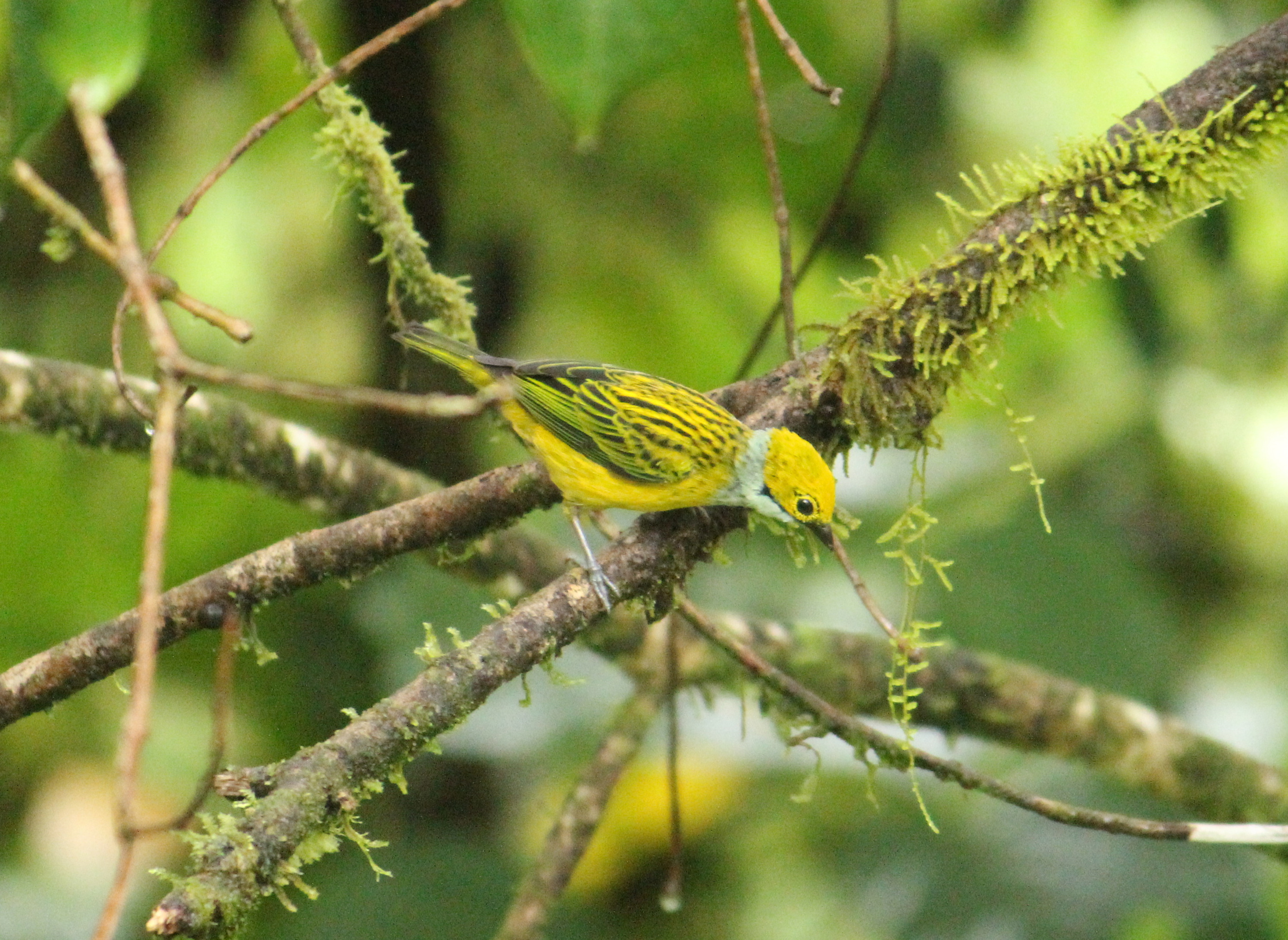 One of our most brightly coloured Tanagers is the Silver-throated Tanager. The male and female of this species are pretty much identical, both mostly yellow with the silver-white throat. They are acrobatic birds and are great fun to watch as they work there way along trunks and branches, often upside down or dangling precariously from a clump of moss.