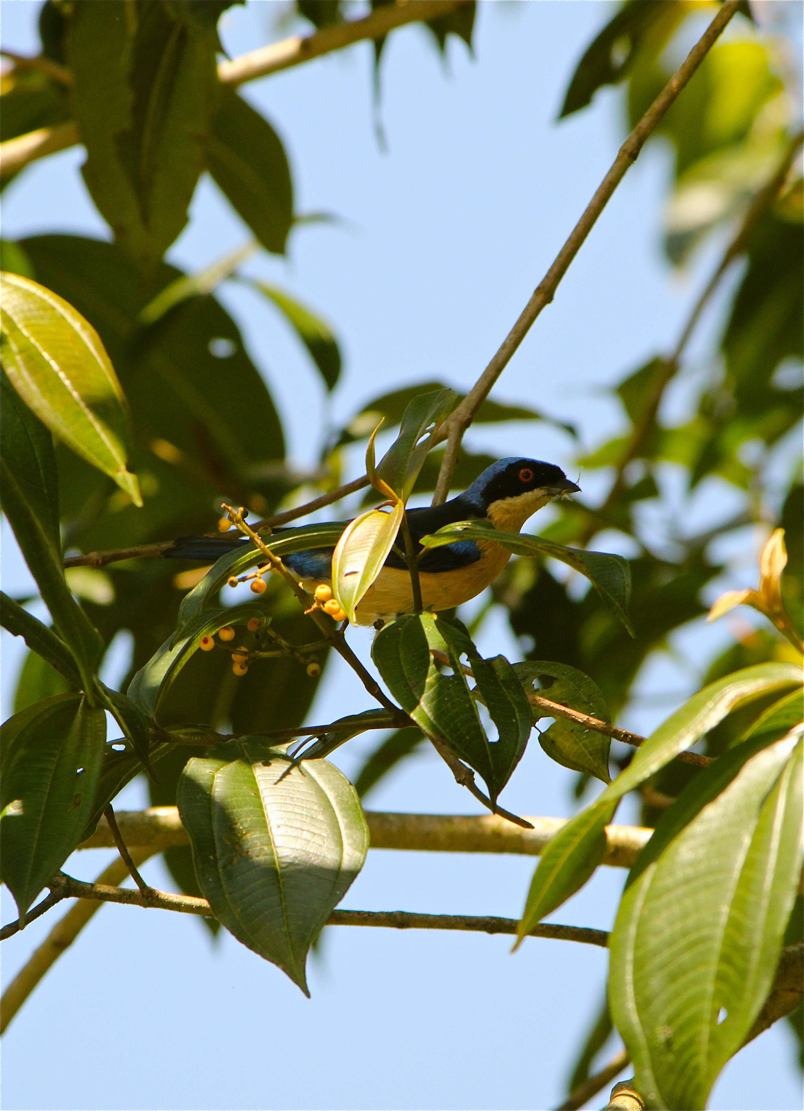 Talking of acrobatic, the Rufous-throated Tanager probably gets the award for the least fearless insect-grabber of the lot. These birds usually stay together as a single species flock and like to forage in the orange tree outside the manager’s bedroom window. They chatter constantly to keep the group together and move slowly through the upper levels of the canopy around the lodge, picking off insects as they go.