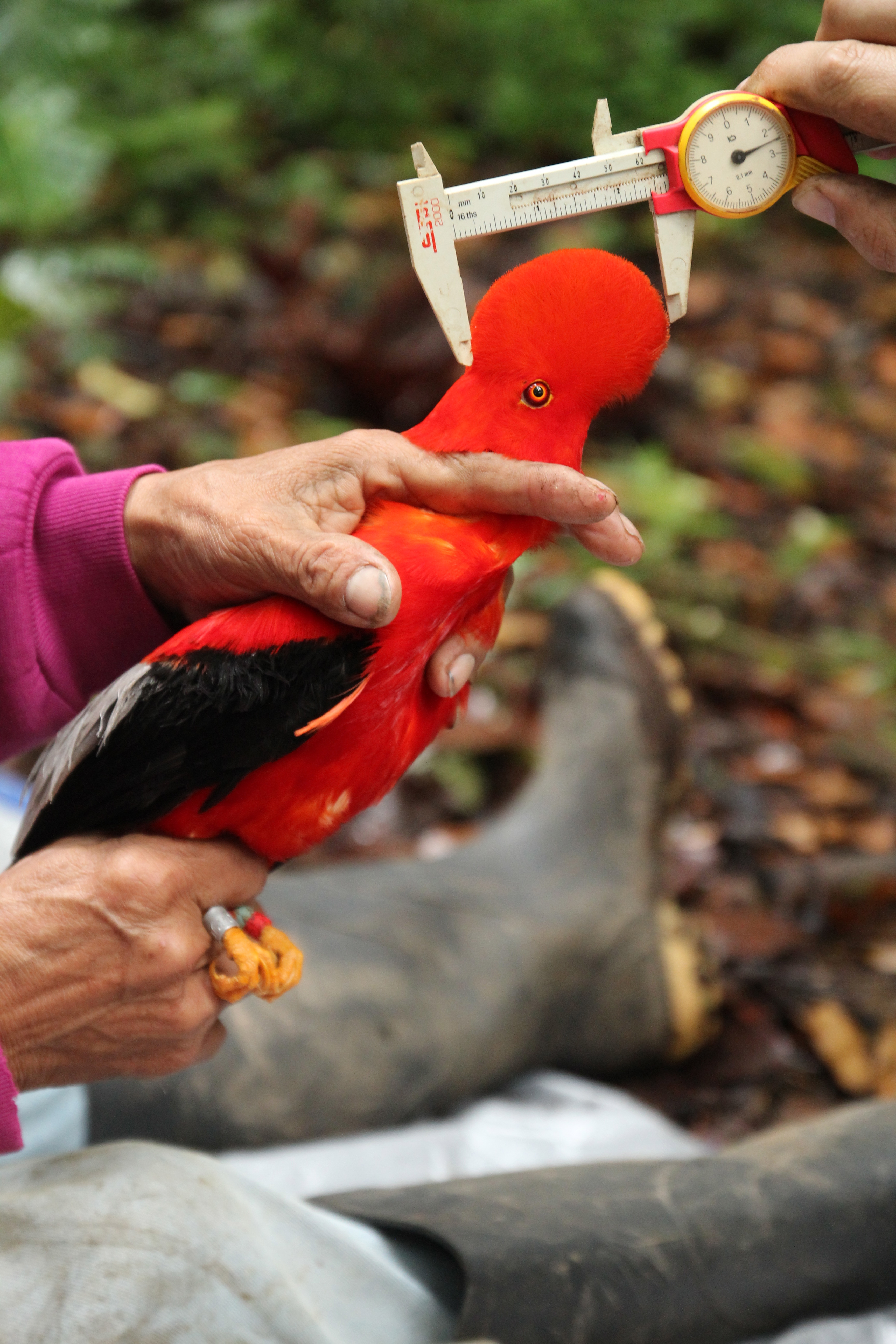 For a week Tom, myself and our brilliant jeffes Pascual and Mauritzio Torres could be found sitting in the jungle in a cloud of insects watching Cock of the Rocks whizz around our heads and, most often, straight past, over or under our nets. We did manage to catch 4 ‘new’ birds and place colour bands on their legs as well as take measurements and blood from them. The reason for this seemingly irrational behaviour was in fact very scientific and I will explain what I can here. Every week Tom and I sit at one of the three research points at the lek and observe which males attend the lek, who they display with, how long those displays last and if any females birds stop by to watch or to mate. The colour bands placed on the right leg of the bird allow us to construct a very clear picture of the interactions going on between the birds attending the lek . We can clearly see which birds are most dominant and monitor their breeding success. In this week we also took the measurements from the birds including weight, wing length, beak length, length of tarsus and the size of their crest. Doing this allows us to monitor the condition of the birds as well as keep track and test the specific idiosyncrasies in a birds’ measurements which arise in the measuring process. Taking blood from the birds also allows us to keep track of genetic trends within the group. For example are the dominant birds at the lek related in some way? We are told there is very little scientific data being collected on this species of bird so all the data we collect is vital to understanding the behaviour, genetics and condition of these bizarre creatures.