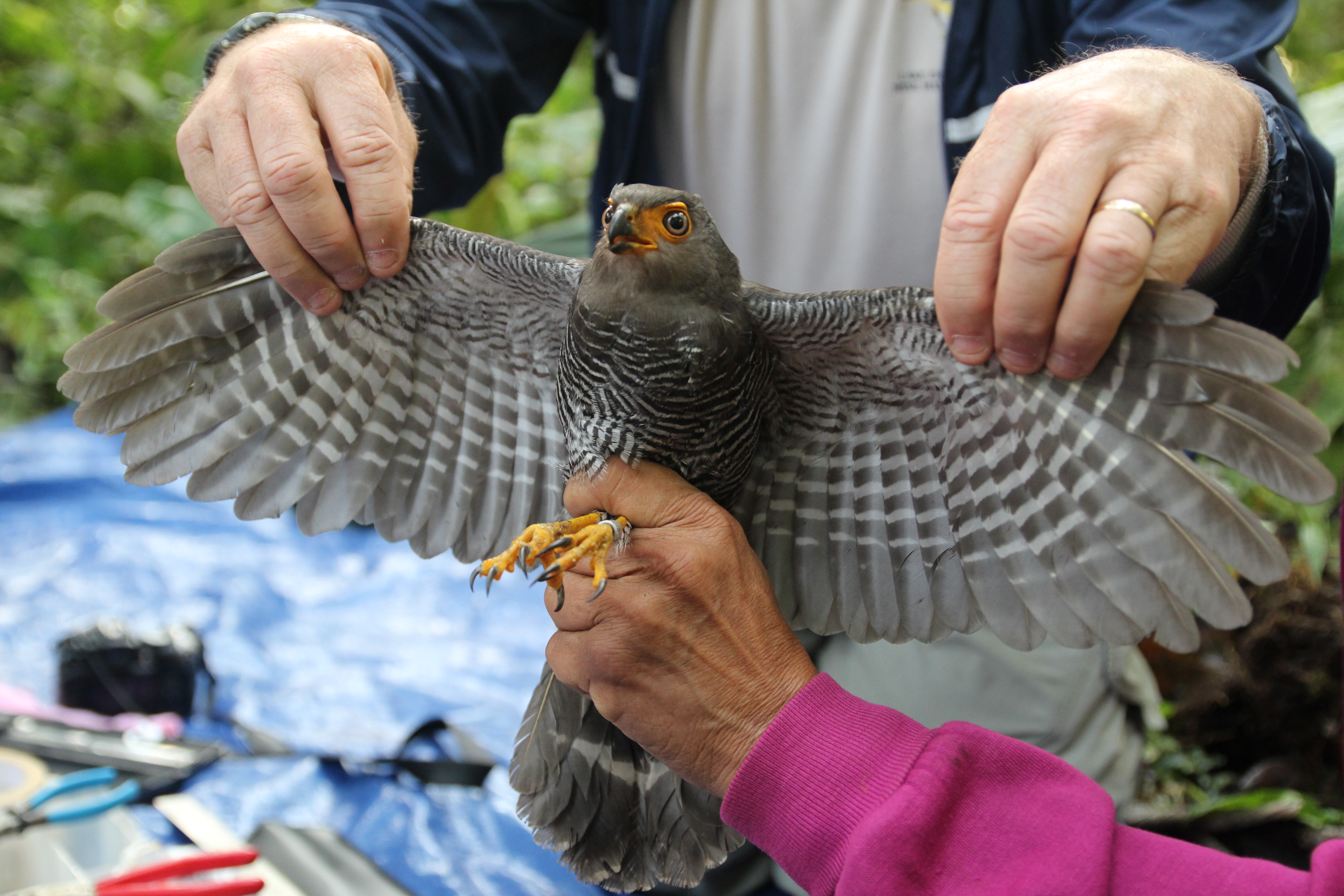 In other areas such as the primary forest the species diversity of caught birds was lower. The reason for this is that our nets were only high enough to catch understory birds and forest floor specialists so often missing birds who stay in the canopy (to catch the Cock of the Rock we had used higher nets). Here we did catch a Blue-winged Mountain Tanager which, although not a first for the reserve, is more commonly seen at higher altitudes and a Barred Forest Falcon, pictured below.