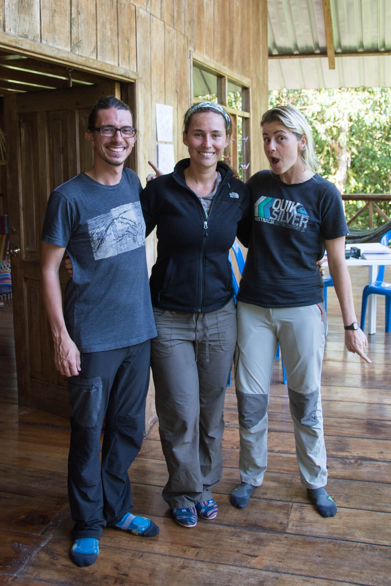 Jane (England), Eliana, and Skye (Australia) catch a glimpse of morning sun — a precious commodity in the montane cloud forest!