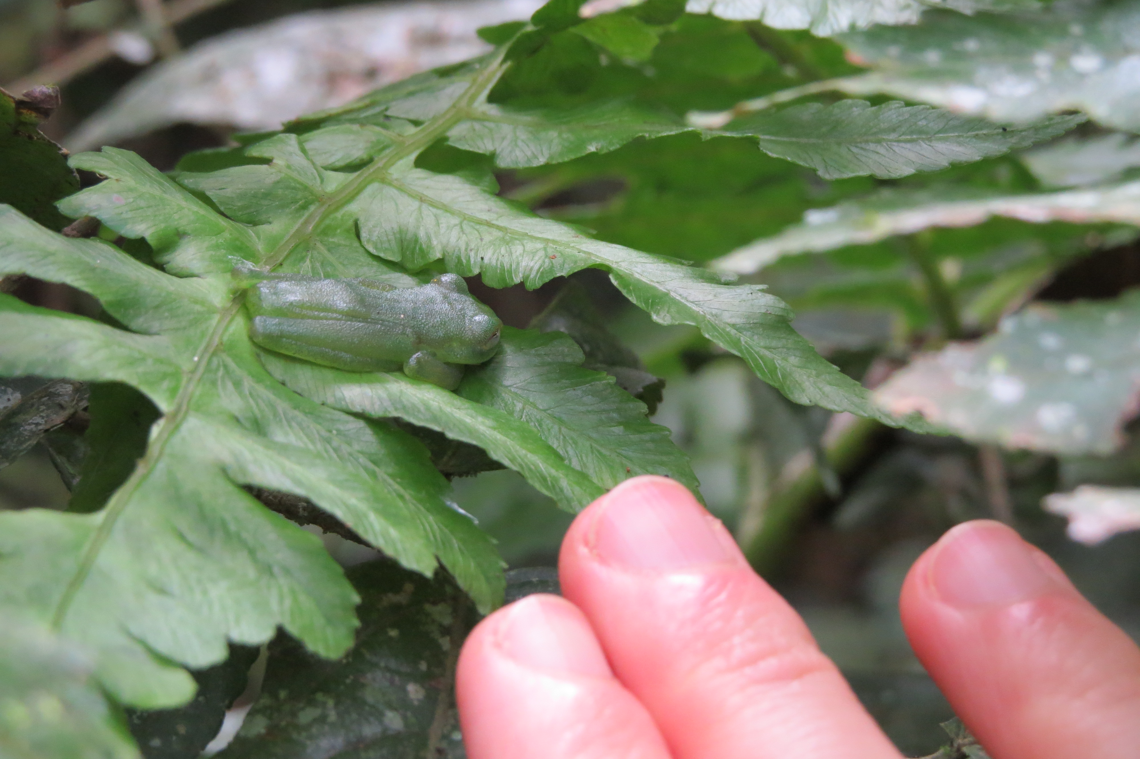 For example, can you spot the Lynch’s glassfrog in this picture? It flattened out its tiny body to even further camouflage itself on this palm frond. I’m not sure how Parks saw it.