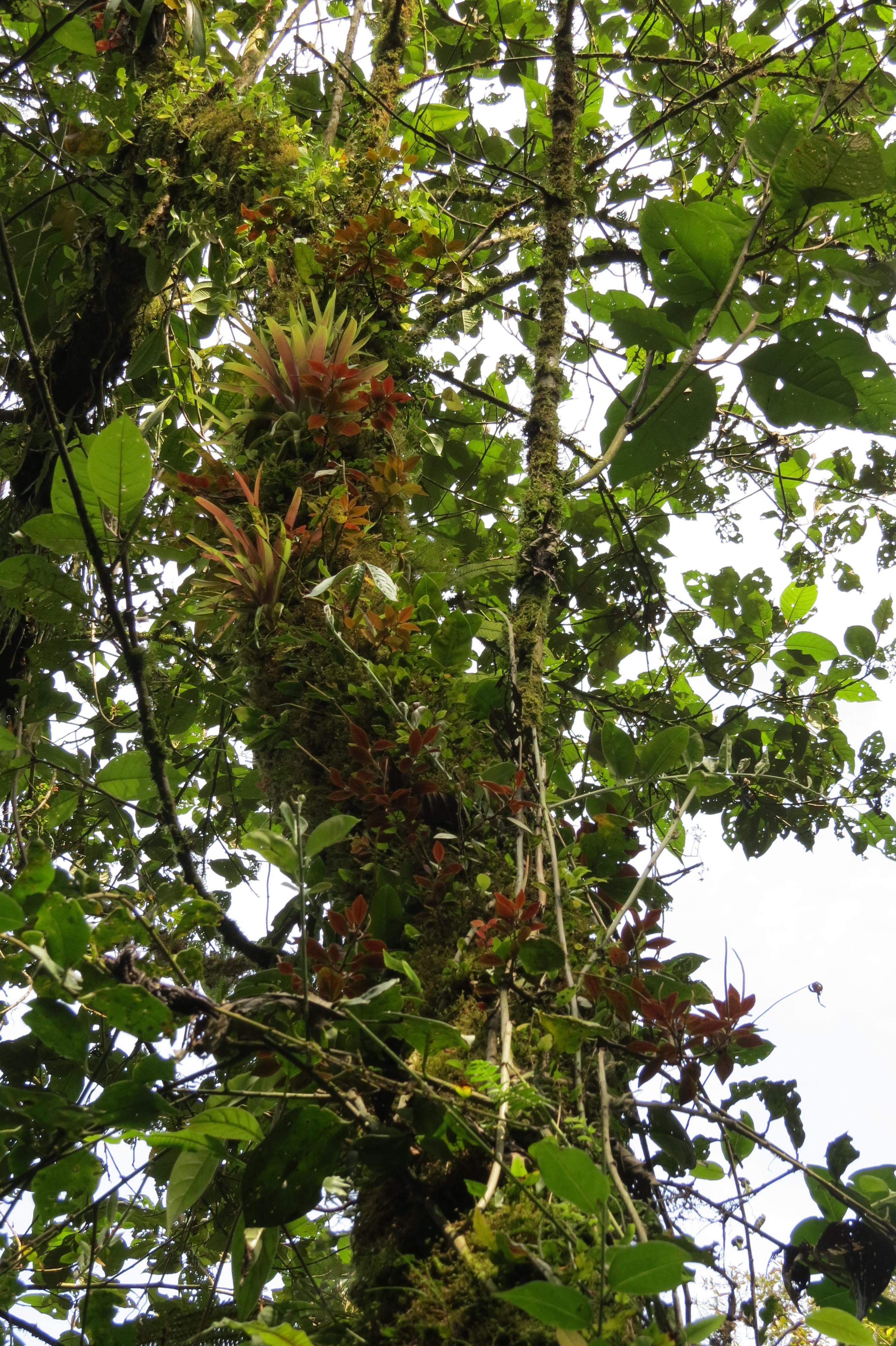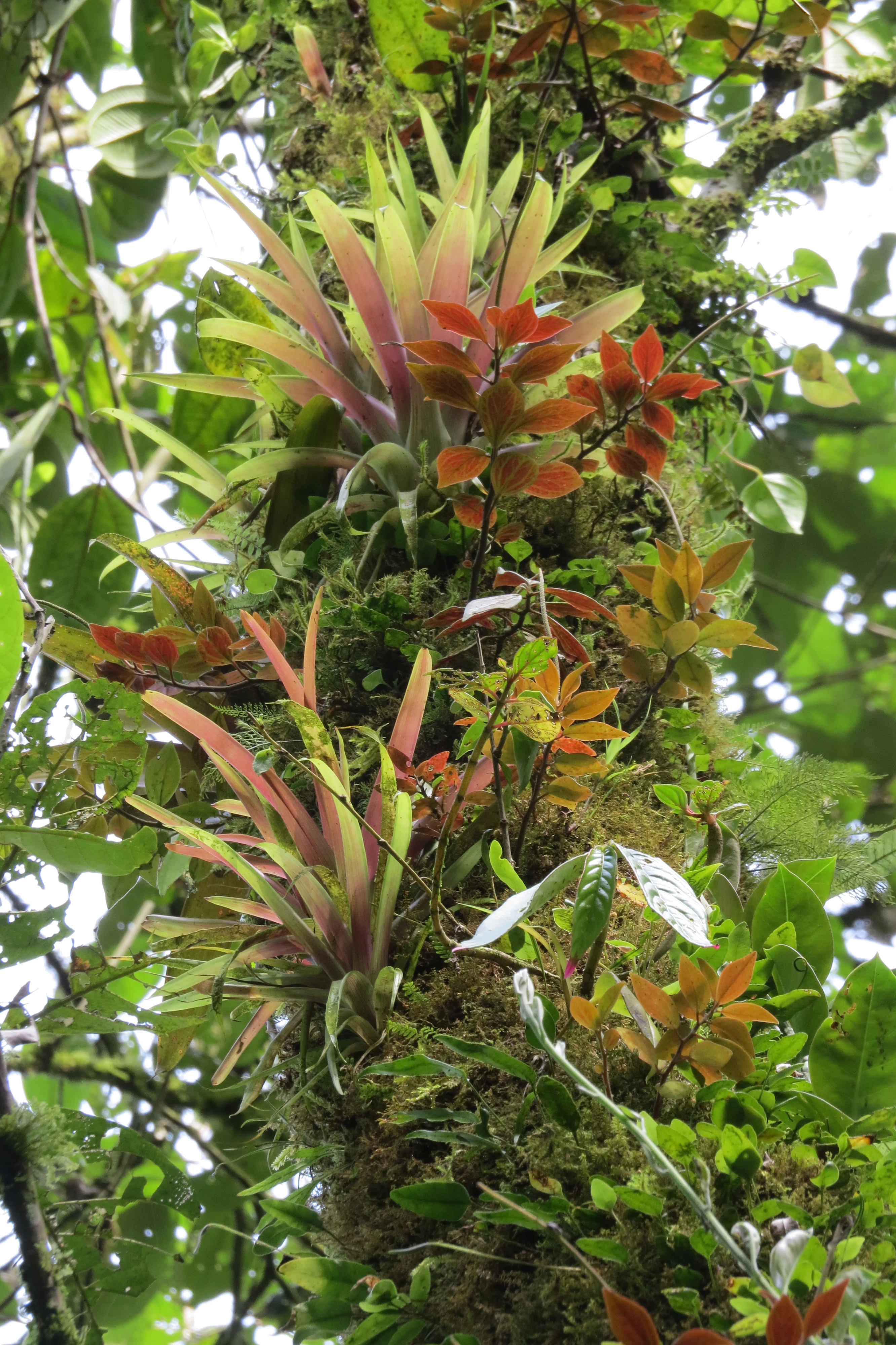 Unlike the towering giants of the Amazon, the cloud forest consists of scattered large trees, with lots of understory shrubs, small trees, and a wide array of fern species, including the huge and prehistoric tree ferns. While the cloud forest is somewhat reminiscent of the classic Tarzan-like jungle with lots of things dangling off trees, it is different in that it is not so dark or enclosed, and while there are vines and lianas, many of the things dangling down are air roots from the vast array of epiphytes that grow on the trees and shrubs. Epiphytes are plants that grow on other plants, but they are not parasitic; they get their moisture and nutrients from the atmosphere. Orchids, bromeliads, philodendrons, mosses, and lichens are just a few examples of the epiphytic plants found here. The forest has the appearance of being constantly decorated for a massive party with hundreds of garlands and flowers draped and hung in the trees.