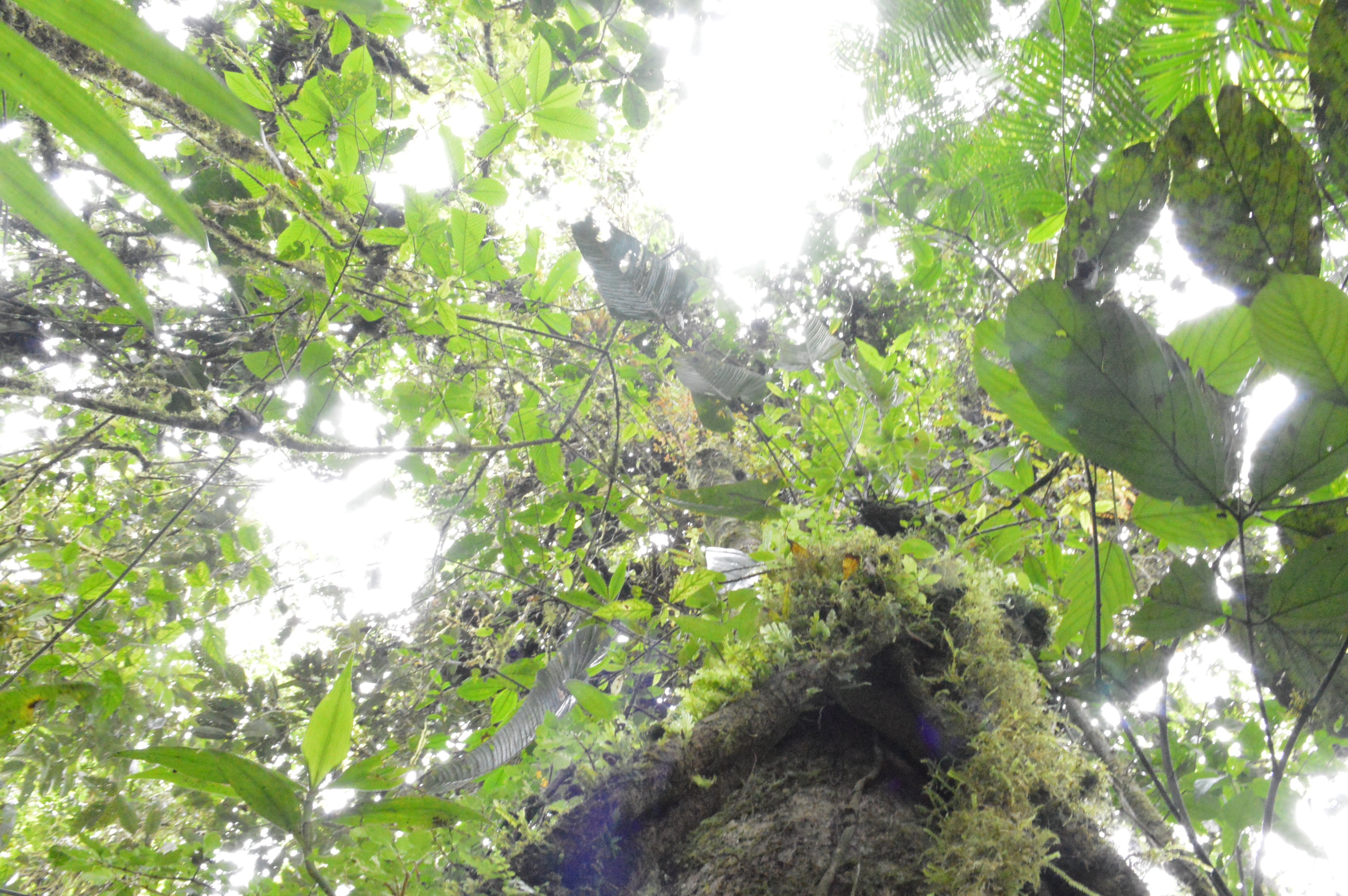A view of a tree looking straight up from the forest floor. You can see the many epiphytes.