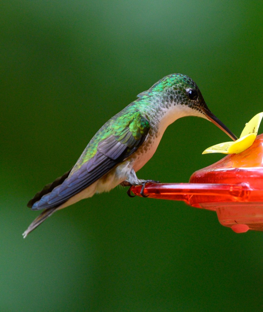Another important reason for conducting these surveys, is that there is still SO much we still do not know about some of these species from a basic life ecology level. In a paper from Rodriques et al. 2013, they publish the demographic parameters of a previously undescribed hummingbird species in southeastern Brazil. Simply by observing the same species monthly for 2 years, scientists were able to collect and publish data regarding this hummingbird’s population dynamics, survival rates, sex ratios, mating displays, migratory patterns, and recommended conservation efforts. Here at RLT, with managers onsite 365 days per year, a focused study on each individual species could give us an accurate depiction of each species ecology, also known as a biographical sketch. For example, below is a photo of one of RLT’s most historically common hummingbirds, the Andean Emerald (Amazilia franciae). Managers have been recording high numbers of individuals from this species at our feeders since their inception in 2014, that means we have over 7 years of population data, behavior assessments, site fidelity, and banding data (which is technically in a separate database, but we have it and could supplement our surveys with it!). We have ALL of this knowledge at our fingertips, however there are NO publications (that I could find anyway) which draw out a biographical sketch of this species. What if this is a keystone species of hummingbirds in the neotropical region? We should have its ecology listed out and available for conservationists to use if need be in the protection of environmentally sensitive areas. There are some excellent opportunities here for students looking into higher education, just saying 😉