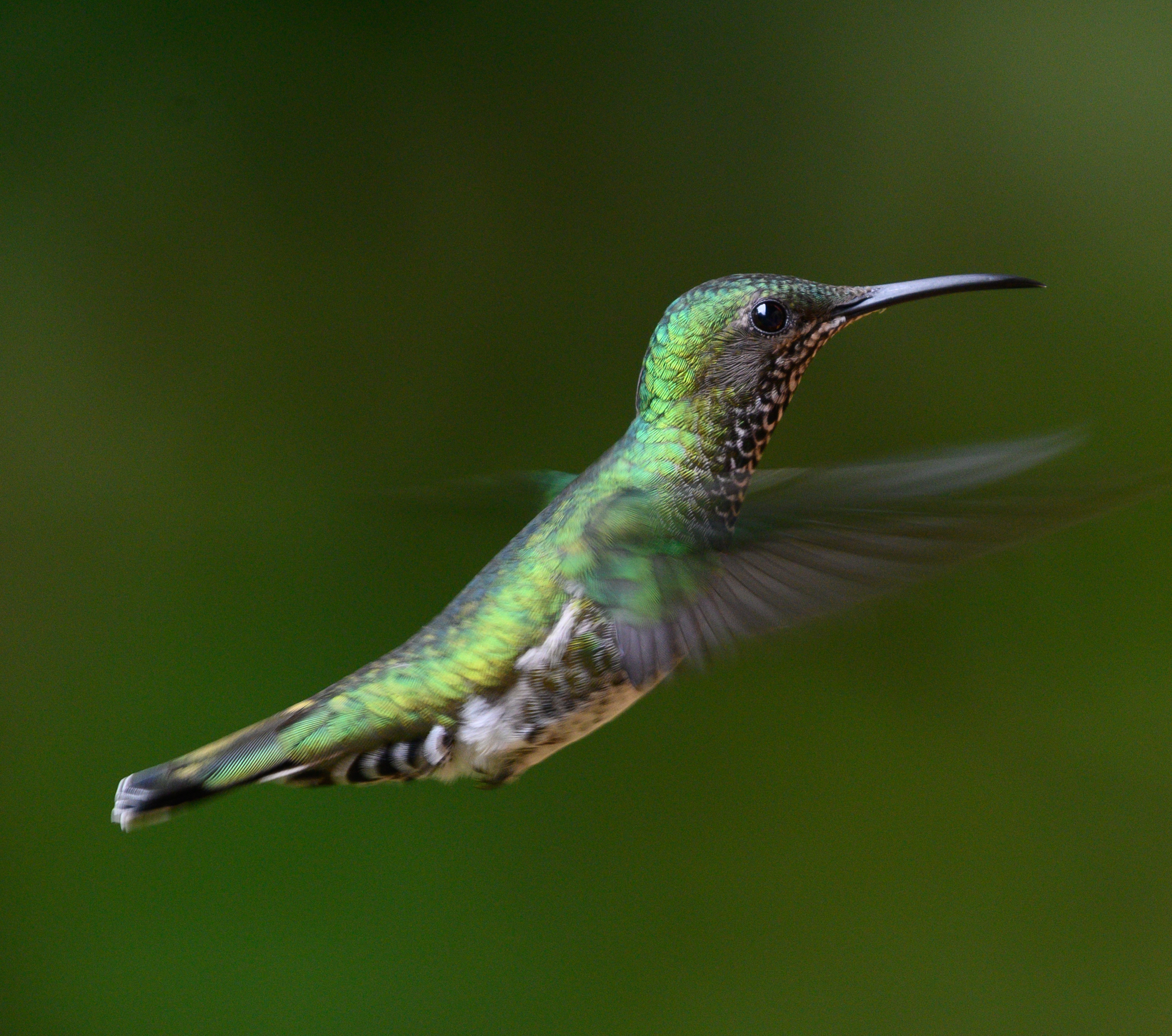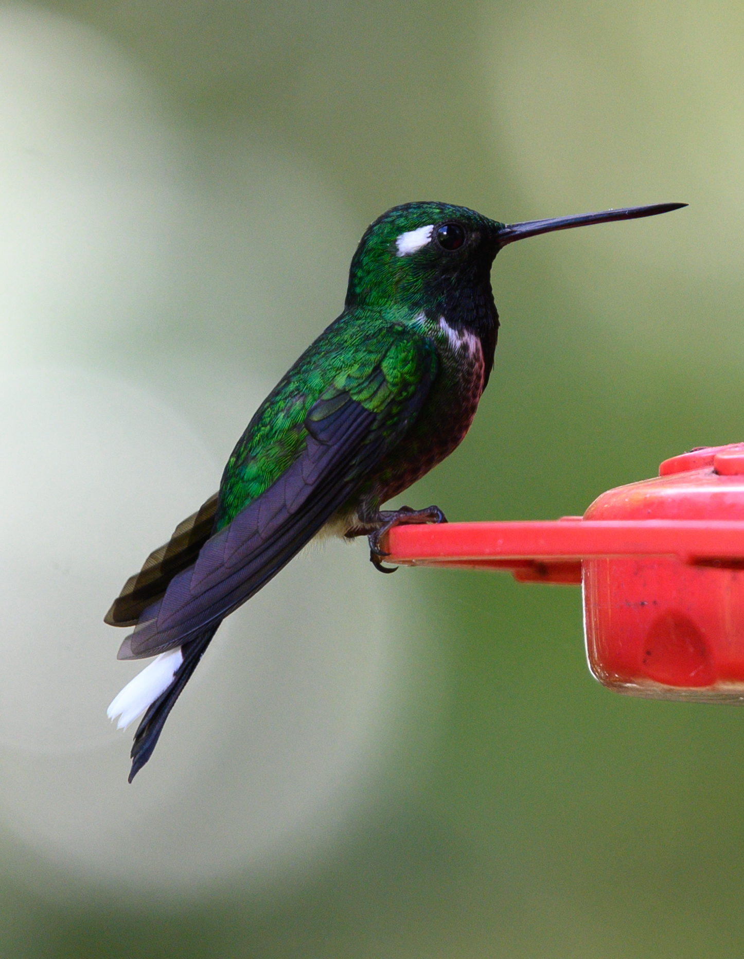 Well, at its most basic level. We are conducting these daily surveys to obtain a population estimate of the hummingbirds which visit feeders in this area. By noting all the various species, counting the number of individuals, and monitoring banded individuals; we are collecting information on the general hummingbird population local to this area (a neo-tropical, montane cloud-forest with a study area at an altitude of 1350m in secondary forest, boarding riparian and primary forest) during all times of day across the wet and dry seasons (there are technically only two seasons here, not four as in temperate environments). Also, as we are a nature reserve since 2005, our study can be replicated in an unprotected area for better comparison as to the importance of nature preservation and its positive effects on the overall health of the ecosystem, but specifically on hummingbirds. This means that due to observed trends over time, we have a fact-based estimate of what species we will see in this environment during any time of year. This can be important information for presentation to government or political officials in the argument against deforestation, planned destruction of natural habitat, or the excessive growth of “eco-tourism” operations near or in protected areas. For example, don’t clear that 2 hectares of primary forest to build an “eco-lodge” because there is a high local population of the rare, Purple-bibbed Whitetip (Urosticte ruficrissa), which thrives in montane forest undergrowth and may be lost if its habitat is destroyed. Do we have proof of how exactly this habitat loss affects hummingbirds? You bet we do! Check out Hadley et al. 2018 (full citation available below in references) for “Forest fragmentation and loss reduce richness, availability, and specialization in tropical hummingbird communities”. Below is a photo of the Purple-bibbed Whitetip male, as they happen to be one of the more prevalent species to visit our feeders, despite their rare status in Ecuador and globally. They could be one of the more vulnerable species to anthropogenic impacts such as deforestation and habitat loss.