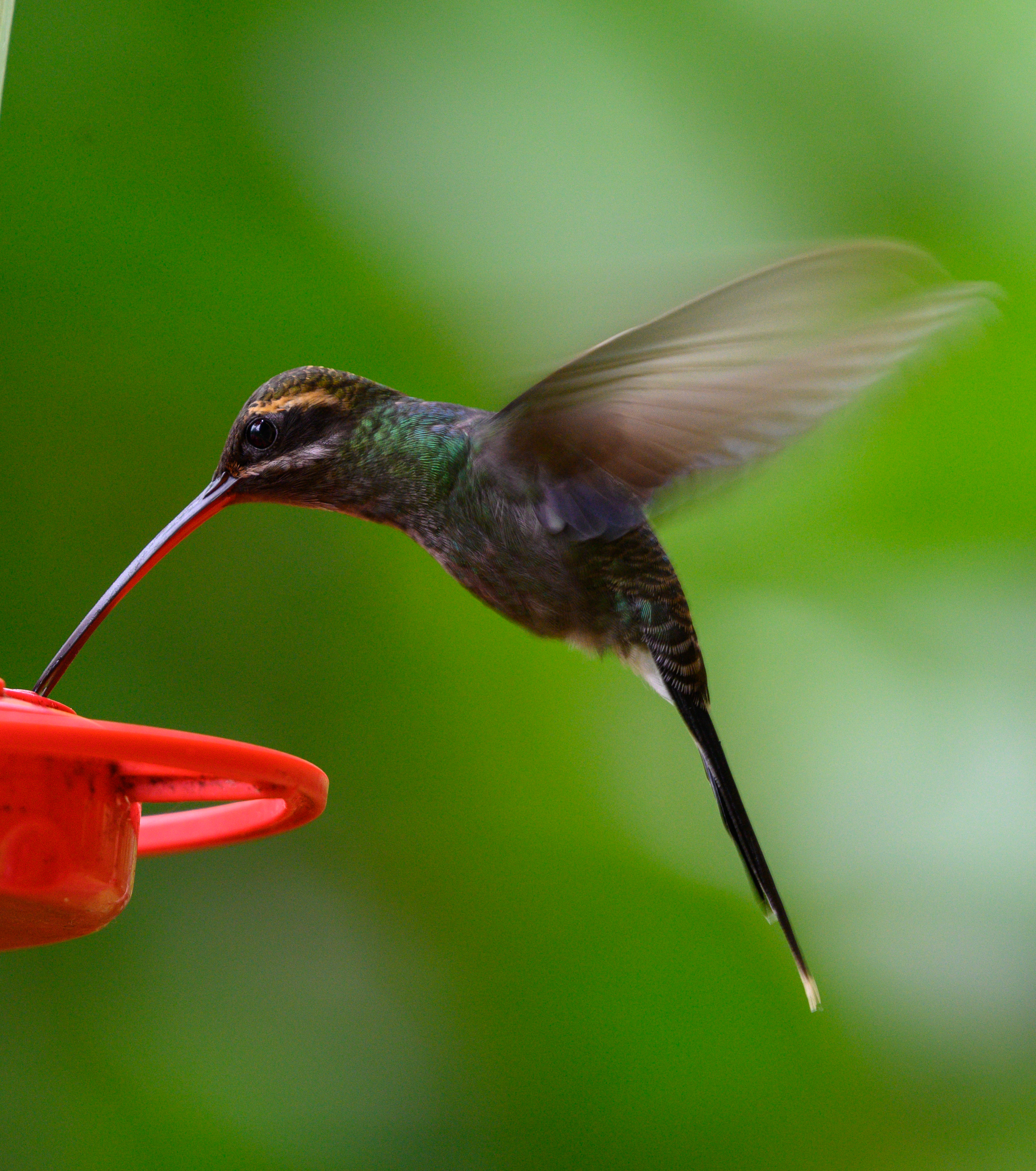 Many of you faithful RLT blog readers will know, as managers of the reserve we not only care for the property, engage with locals and tourists who visit us, but we also conduct a variety of long-term avian based research projects. One of the most popular of these research projects is a daily hummingbird survey. A photo of a female White-whiskered Hermit (Phaethornis hispidus) visiting one of the RLT feeders is below.