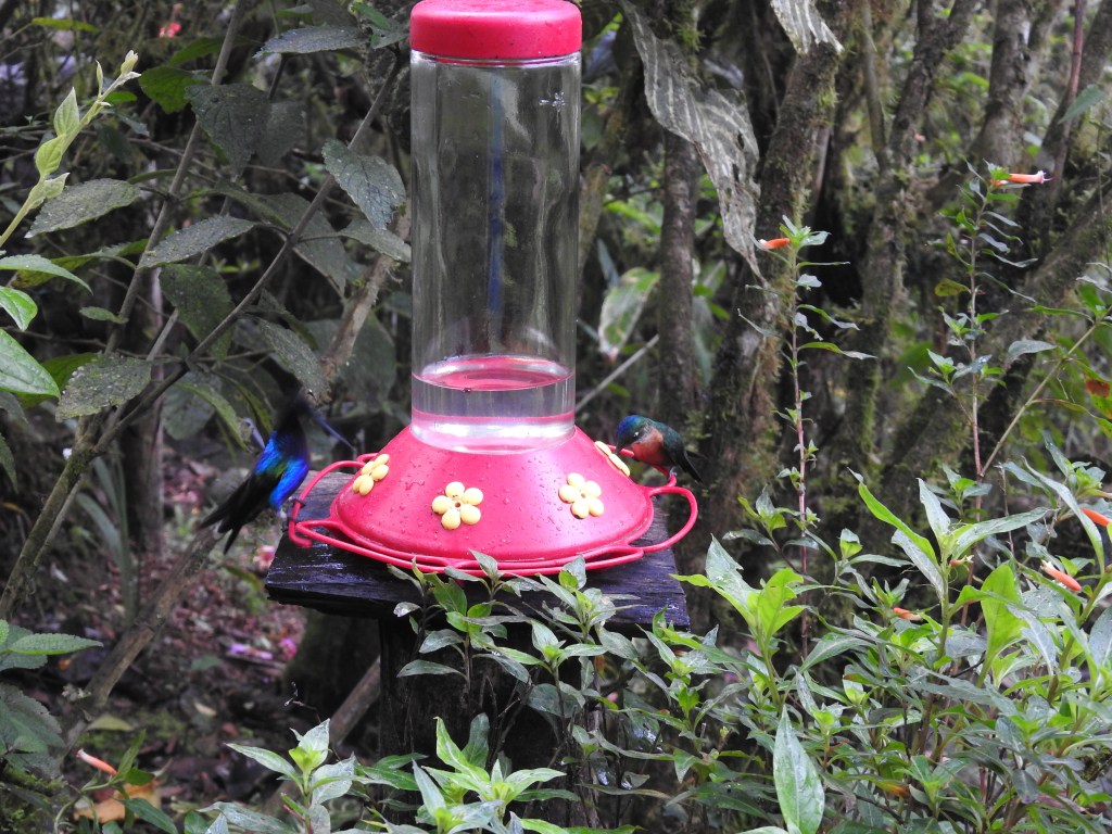 Then there are the ornithology projects, which are probably the easiest part of the job, especially for stewards with a biological science background. I especially enjoy watching the 3 hummingbird feeders for an hour each day to determine which species are around from day to day, season to season, year to year, and if some are increasing or declining. I get my cuppa ready, space 3 feeders about 5 feet apart and sit down with the data sheet to watch the hummer show. Almost always, a purple-bibbed whitetip female arrives first, raising her wings as she lands – ta daa! Huge Empress Brilliants swoop in and out like big bats, while Andean Emeralds, with their perfectly white breasts, shimmer and rattle. Usually, 10 to 14 species of hummingbirds visit the feeders during an hour.