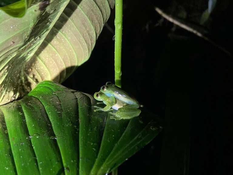Just as the seasons change, the gradient of day to night offers new cacophony of sounds, with frogs maintaining the overwhelming majority. Despite this being the season of rain, we experienced a drought for over a week, much to the chagrin of the amphibian life that thrives in the moist cloud forest. However, after two days of consistent rain, a trip down to the river revealed some reveling in the return to normality. About a dozen Emerald glassfrogs were perched on leaves overhanging the Rio Nambillo, some expanding in size to produce metallic calls and others caught amplexing for the future generations.