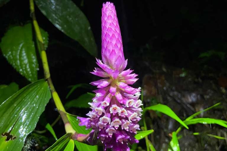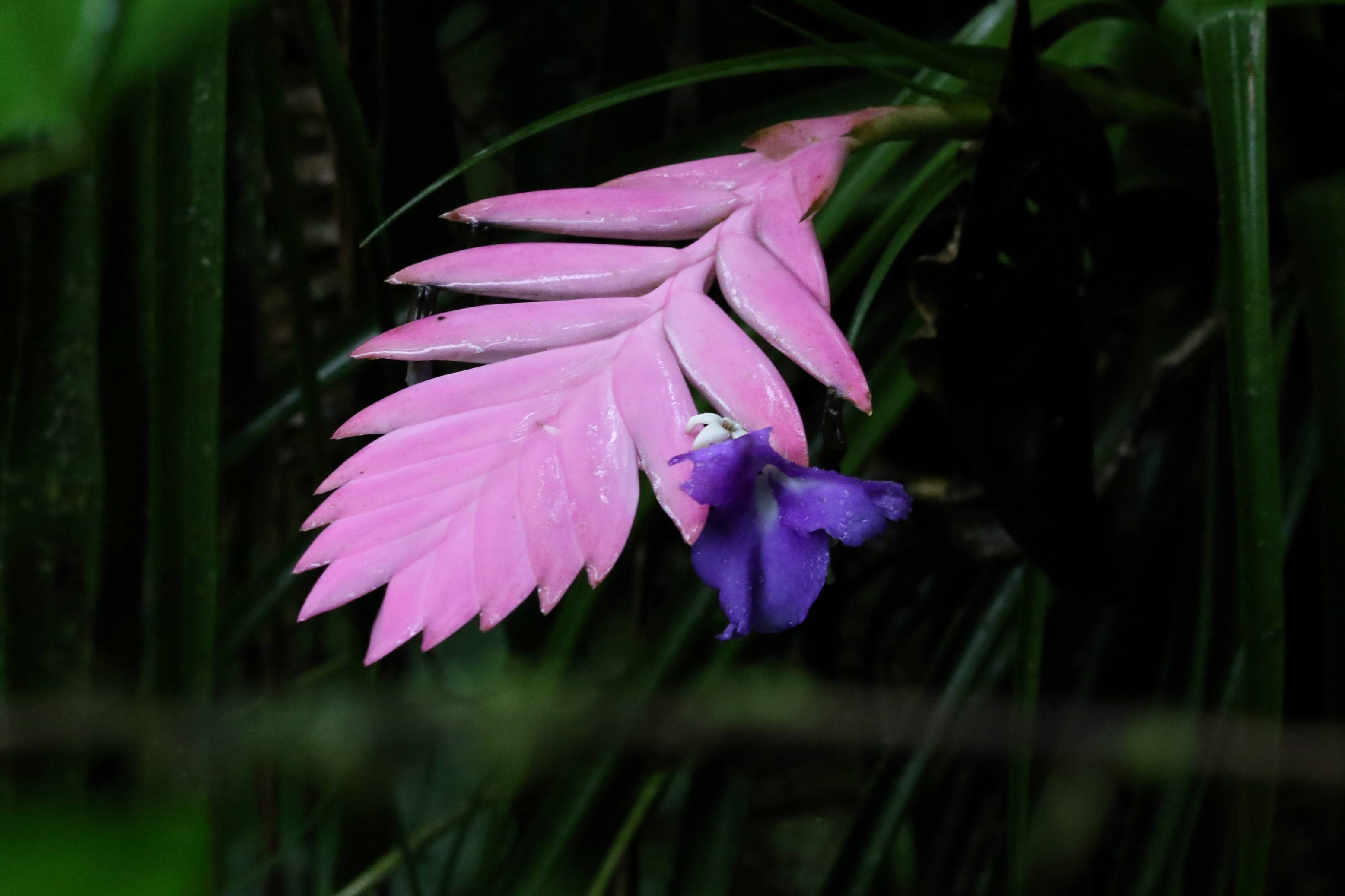 It started, seemingly to my untrained eye, with bright splotches of purple decorating all levels of the forest. Two different species of epiphytic plants began flowering at the start of the month, one an orchid (Elleanthus sp.), the other a bromeliad (Wallasia sp.). The orchids grew outward, slowly opening each individual flower into a cone of bright purple. The bromeliad flowers sprung up almost overnight, like fuschia colored ferns unfurling to give way to deep violet petals at the tip. In subsequent haste, different pinks began to pop up all over the forest, providing the fast-moving hummingbirds with ample nectar to keep their hearts beating fast and their heads full of pollen.
