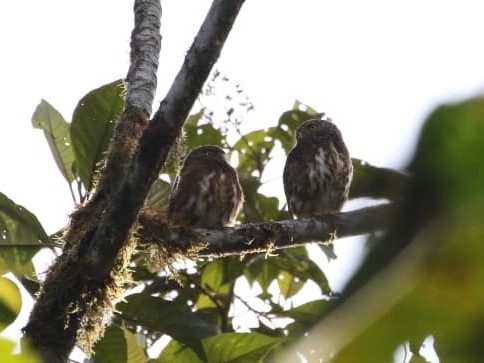 As for the other birds, small hints have woven themselves into everyday interactions. Bay wrens tote around grasses in their beaks, flame-rumped tanagers collect mosses, and lineated foliage-gleaners make alarm calls when I approach their mossy nursery. The slaty-antwrens chase and flit through the brush, females calling, and fleeing when approached by males. The squirrel cuckoo has taken residence on the ridge behind the cabana, sending off wanton notes into all hours of the day. A pair of cloud forest pygmy owls travel in unison, facing the dizzying bombardment of other birds together, as four bright yellow eyes instead of two.*