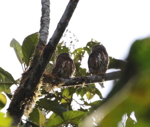 As for the other birds, small hints have woven themselves into everyday interactions. Bay wrens tote around grasses in their beaks, flame-rumped tanagers collect mosses, and lineated foliage-gleaners make alarm calls when I approach their mossy nursery. The slaty-antwrens chase and flit through the brush, females calling, and fleeing when approached by males. The squirrel cuckoo has taken residence on the ridge behind the cabana, sending off wanton notes into all hours of the day. A pair of cloud forest pygmy owls travel in unison, facing the dizzying bombardment of other birds together, as four bright yellow eyes instead of two.*