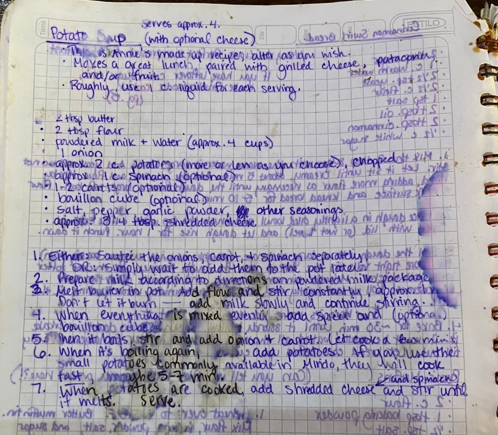 It’s been instructive. It makes us realize how many of the foods that we put in the fridge don’t need to be there. It turns out that most leftovers can sit out for a couple of days before they start to go bad. Most sauces don’t need to be refrigerated at all, nor do eggs or most vegetables or fruits if you eat them within a week or so. Not that we store most fruits and veggies in the fridge under normal circumstances, but foods often shuffle around, so it’s not unusual. Cheeses like mozzarella can happily sit wrapped up for a few days in cool water. That leaves milk and meat, and we do miss those. Our milk is powdered. “Leche en Polvo.” You get used to it. As for meat, we typically buy enough for a meal with leftovers when we go to town, so we get to eat it maybe two days per week. Eggs and beans fill in the protein gaps. Do we miss our refrigerator and chest freezer back home? Yes. But it’s good to know that life isn’t terribly inconvenient without them.