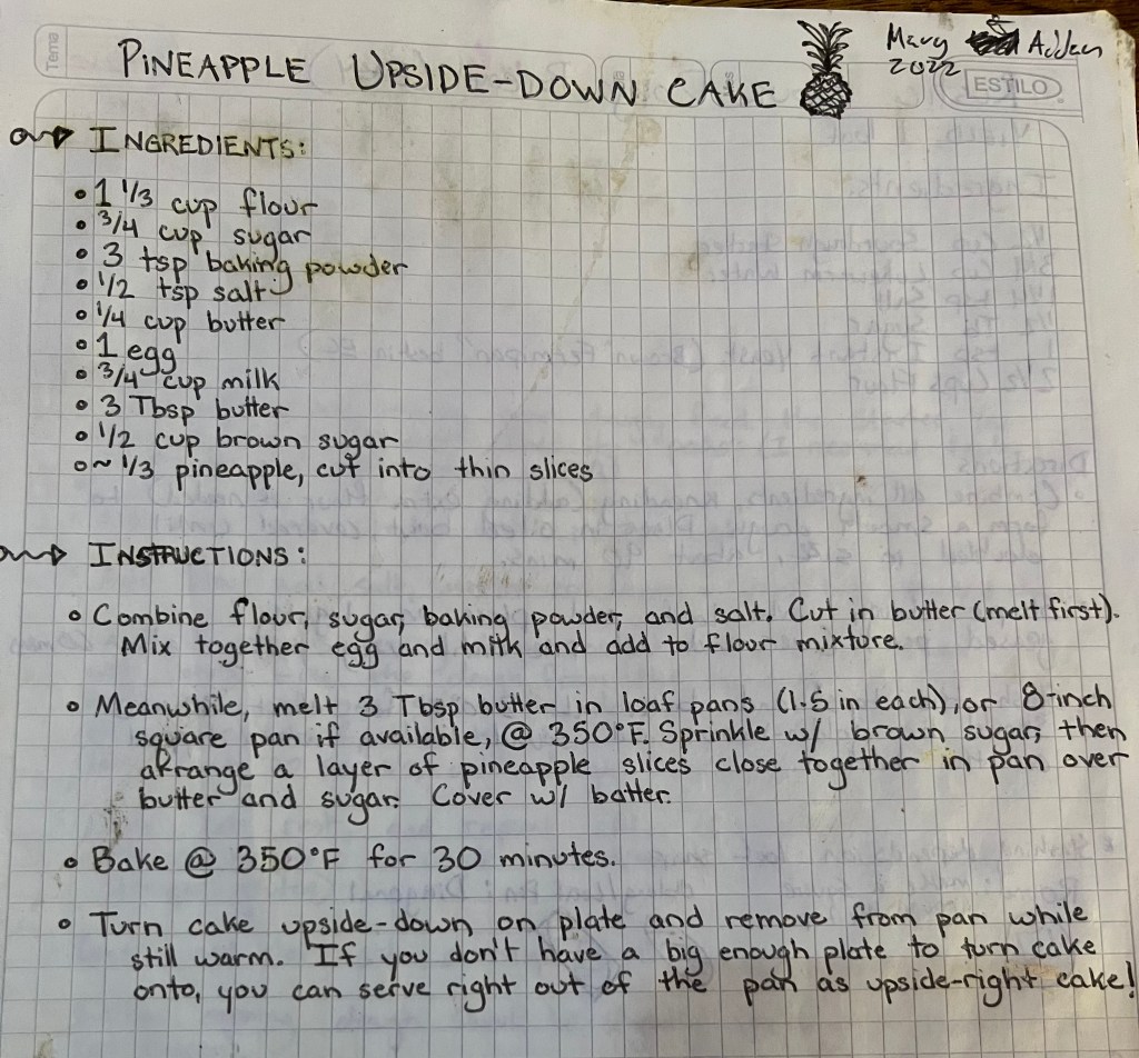 We also really like the pineapple upside-down cake, which Emily has modified by adding little pieces of pineapple to the batter itself. That makes it even more moist. Just don’t overdo it or it won’t bake properly.