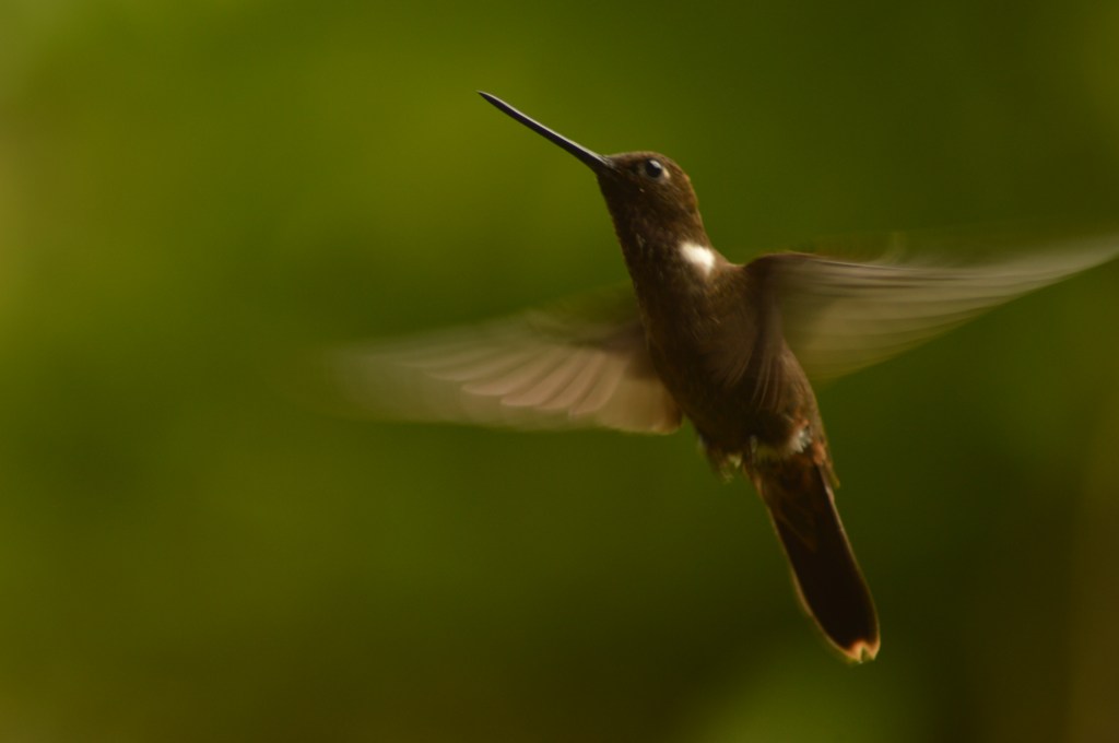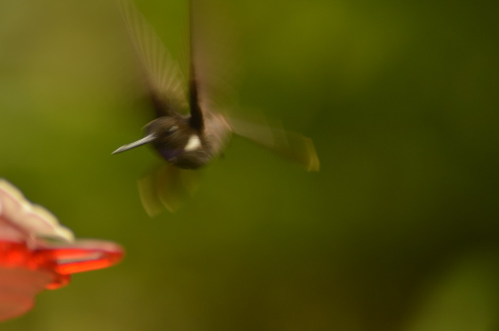 A few of the other species tend to be much shyer. One of our favorite birds to see at the feeders is the Brown Inca (Coeligena wilsoni). This large brown hummingbird, with a beautiful white spot on its neck, shows up far less than the other birds we see at the feeders, though he or she will generally show up once a day. Rarely have we seen more than one at a time, but it does happen. He comes in and takes a sip, then quickly flies backwards, hovering for a second before returning to sip. A few repetitions of this sequence, and if it hasn’t been run off yet by its more aggressive neighbors, the Brown Inca typically takes off. This bird’s range is extremely limited, only existing in the cloud forests on the western slope of the Andes in norther Ecuador and southern Colombia.