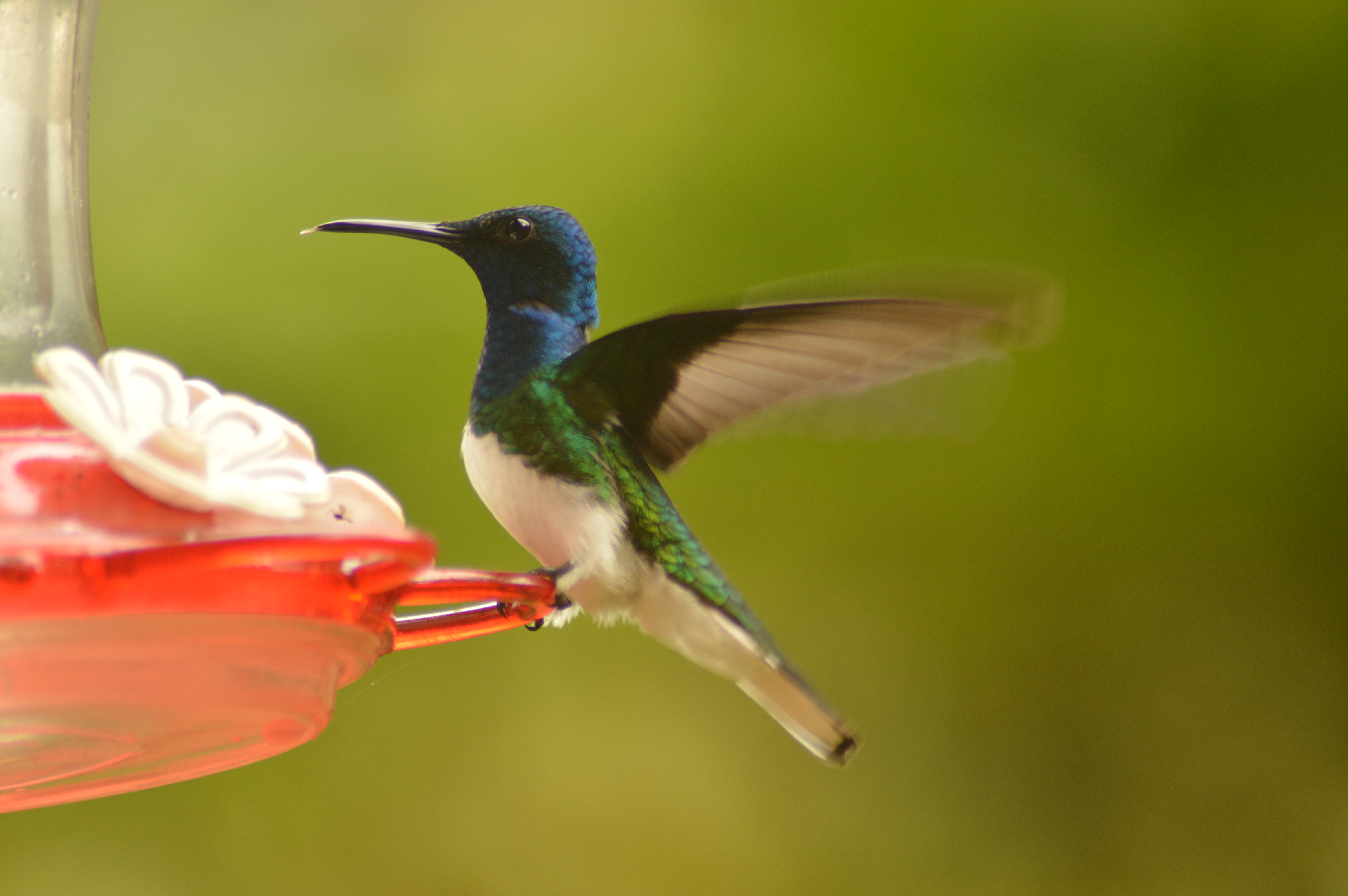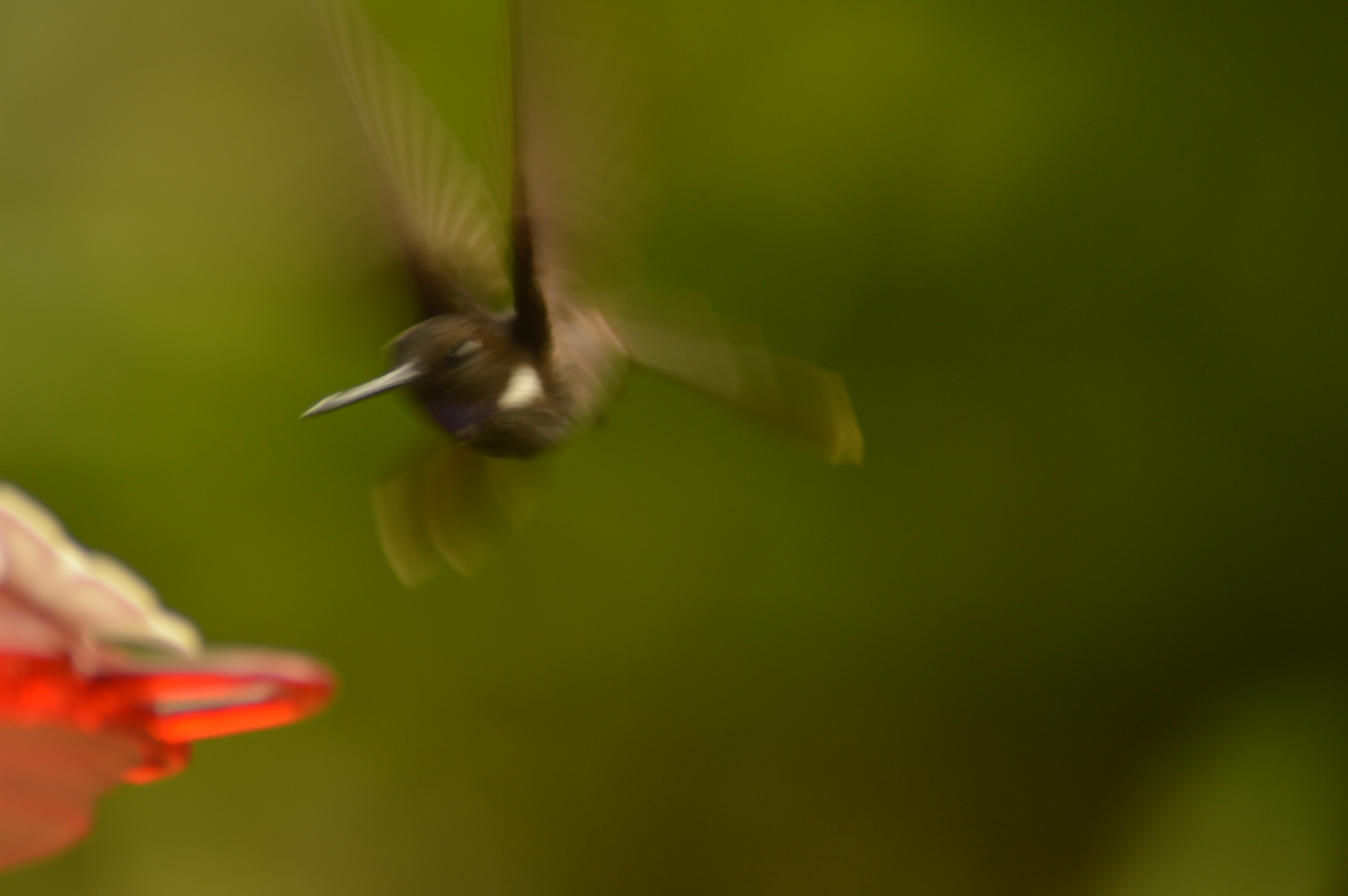 Just based on our short observations, we have noticed some species seem to be much more aggressive than others. To begin, the Crowned Wood Nymph (Thalurania colombica) males frequently run off other species and individuals at the feeders. With a seemingly angry deet-deet-deet-deet, they spread their wings and tails wide making themselves look big before surging towards their target. For a while, a Green-crowned Brilliant (Heliodaxa jacula) male sat on the post on which our second feeder hangs. He would sit there not drinking from the feeder except for the occasional quick sip; instead, he would wait for any other bird to attempt to land at his chosen feeder then run them off into the trees. We noticed this occurring for about a week before he seemed to get bored and stopped guarding the feeder so intensely.
