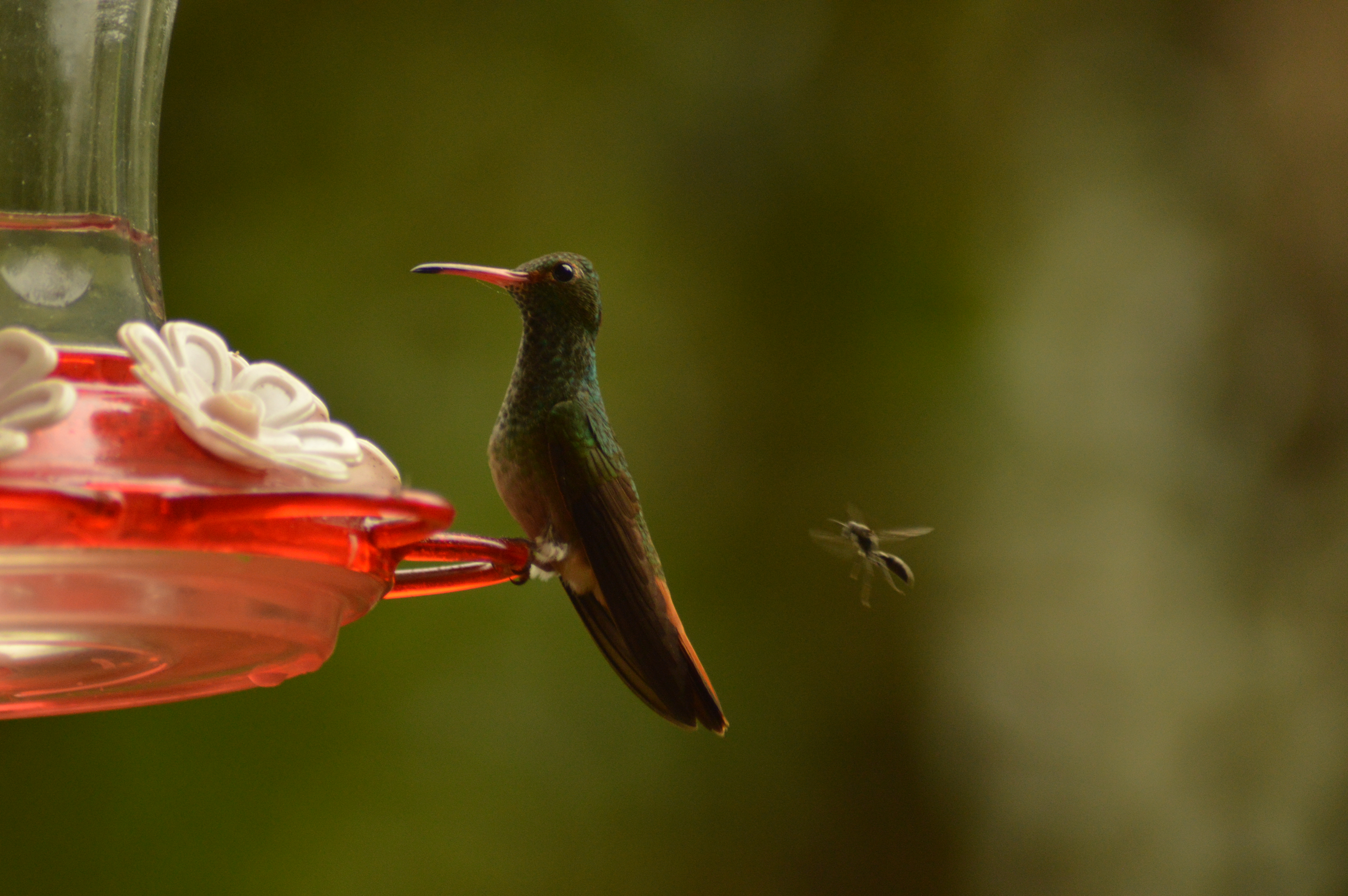 When we first arrived, we hardly saw any Rufous-tailed Hummingbirds (Amazilia tzacatl). However, we started putting vegetable oil on the surfaces of the hummingbird feeders, as the bees were taking over and it seemed to be bothering the birds quite a lot. Since putting oil on the feeders, the bees have completely stopped investigating the feeders (and subsequently drowning themselves in sugar water after stubbornly crawling their way inside). Closely following the departure of the bees, the Rufous-tailed Hummingbird started coming much more frequently. Now we seem him about once a day, and have even seen two at once. He is a much shyer bird than the others that visit the feeders, so we suspect that the bees pushed him out of his comfort zone to the point he no longer felt it worth it to visit. While he is seemingly less likely to attack other birds at the feeders, we have noticed it defending a feeder twice now!